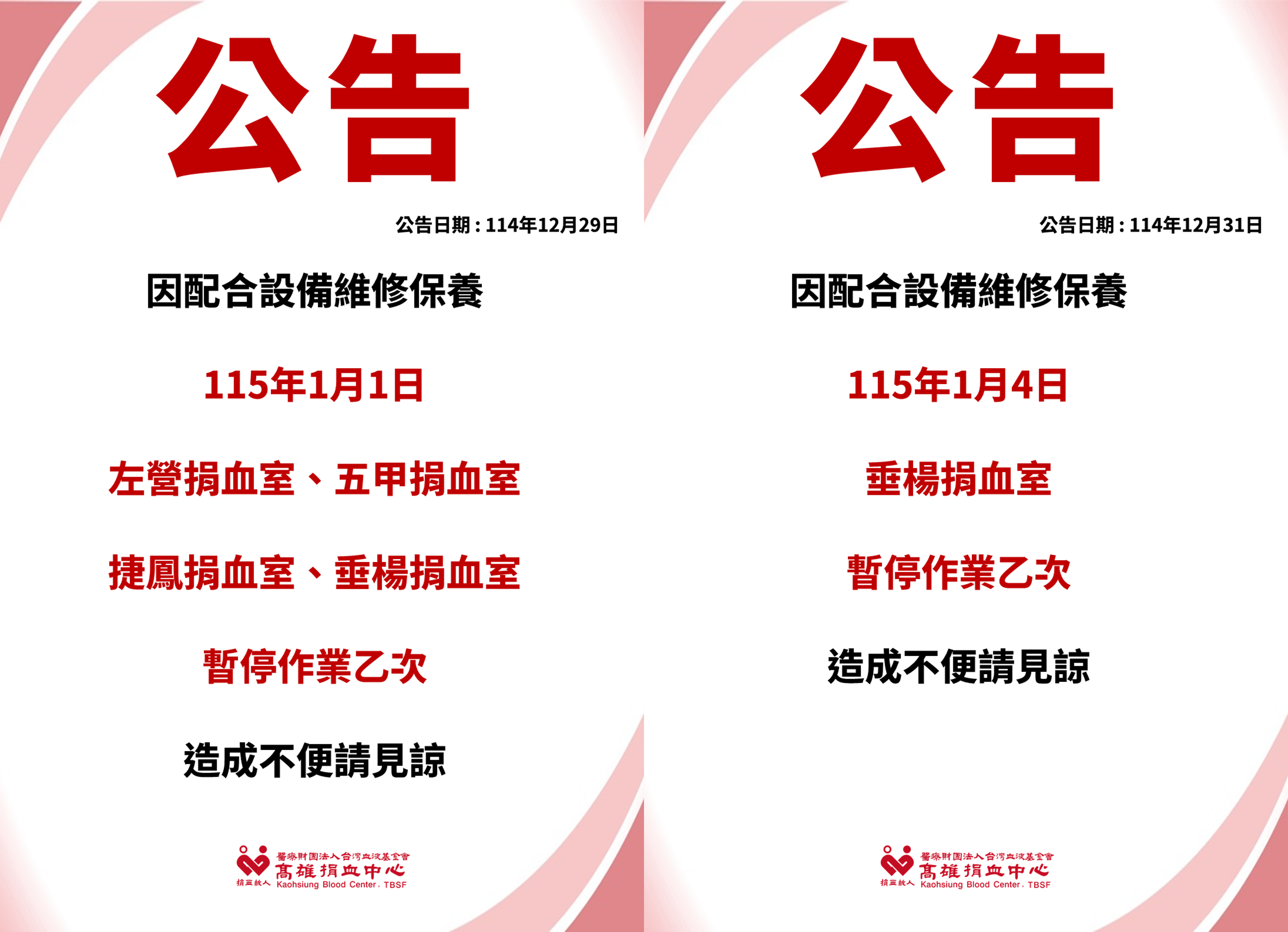 【暫停作業公告】115年1月1日、1月4日部分固定捐血室暫停作業 2025/12/29 異動公告 📢 作業異動公告 因配合機台保養 115年1月1日 左營捐血室 五甲捐血室 捷鳳捐血室 垂楊捐血室115年1月4日垂楊捐血室 以上固定捐血點暫停作業 1 日,造成不便,敬請見諒。
