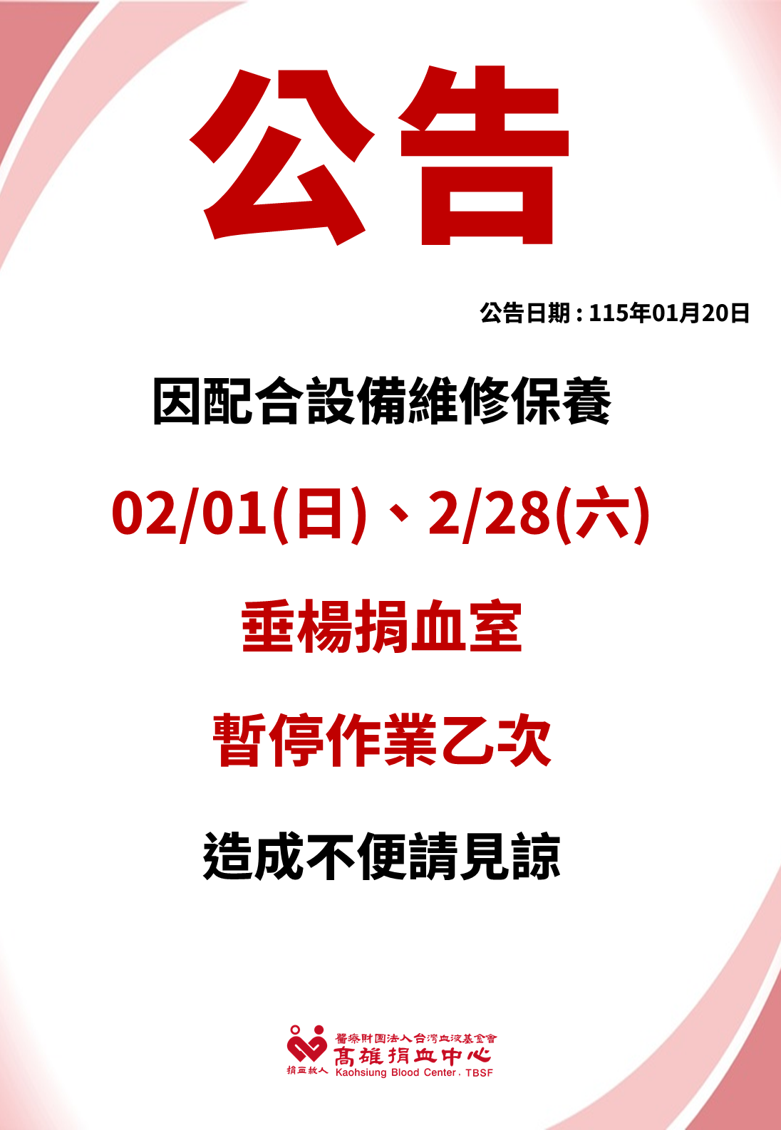 【暫停作業公告】115年2月1日、2月28日垂楊捐血室暫停作業 2026/01/20 異動公告 📢 作業異動公告 因配合機台保養 115年2月1日、2月28日 垂楊捐血室 暫停作業 ,造成不便,敬請見諒。